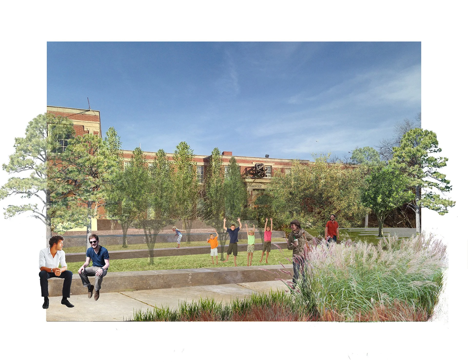The campus engages the curiosity of its students/educators through greenhouse entries, 60KW of PV arrays, integrated art displays, 87,000 gallons of water cisterns and several outdoor learning studios. Freedom to explore the campus is accomplished through 100,000 SF of open space, over 100 new trees, new ADA accessibility, multiple terraces, a board walk to connect 7th street to 6th street and a 1/10 mile elevated ellipse that subtly competes with the dominating presence of the historic Harwood Building.